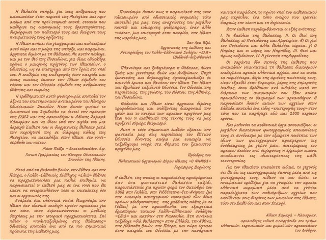 «Η έκθεση, της οποίας οι παραστάσεις προσφέρονται σαν ένα φανταστικό θαλάσσιο ταξίδι, παρουσιάστηκε για πρώτη φορά τον Οκτώβριο του 2008 στη Γαλλία, στη Villeneuve-lez-Aνignon [με την ευκαιρία πανηγυρικού εορτασμού των δέκα χρόνων αδελφοποίησης της γαλλικής πόλης με το Γύθειο] με την πρωτοβουλία του εξαιρετικά δραστήριου τοπικού Γαλλο-Ελληνικού συλλόγου «Ελιά» και κατόπιν στη Μασσαλία. Στη συνέχεια ταξίδεψε «διά θαλάσσης» στην Ελλάδα, την Αθήνα, την Νεάπολη Βοιών, την Πάτρα, και τώρα έφτασε στην πατρίδα του Οδυσσέα με την πανάρχαιη ναυτική παράδοση, το πρώτο νησί του εκθεσιακού μας περίπλου, ένα τόπο ονείρου που εμπνέει διαρκώς την τέχνη και τη λογοτεχνία.