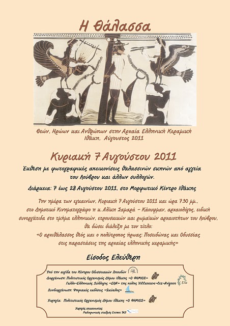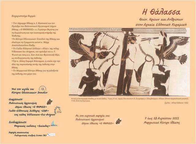 H περιοδική έκθεση με θέμα «Η θάλασσα θεών, ηρώων και ανθρώπων στην αρχαία ελληνική κεραμική» σε συνεργασία με την αρχαιολόγο Αλίκη Σαμαρά-Κάουφμαν ειδική συνεργάτιδα του τμήματος ελληνικών, ετρουσκικών και ρωμαϊκών αρχαιοτήτων του Μουσείου του Λούβρου, τελεί υπό τη αιγίδα του Κέντρου Οδυσσειακών Σπουδών, την διοργάνωση και χορηγία του Πολιτιστικού Οργανισμού του Δήμου Ιθάκης «Ο ΦΗΜΙΟΣ», την συνδιοργάνωση του Γαλλο-Ελλληνικού Συλλόγου «ΕΛΙΑ» της πόλης Villenerve-lez-Avignon και του Βιβλιοπωλείου «ωκύαλος» θα κλείσει τη «διαδρομή» της στην Ιθάκη. Χορηγοί επικοινωνίας Ραδιοφωνικός σταθμός Cosmos 965 και Ηλεκτρονική εφημερίδα www.ithacanews.gr. Η έκθεση θα παρουσιαστεί στις 7 Αυγούστου στο Μορφωτικό Κέντρο Ιθάκης και θα διαρκέσει τρεις εβδομάδες.